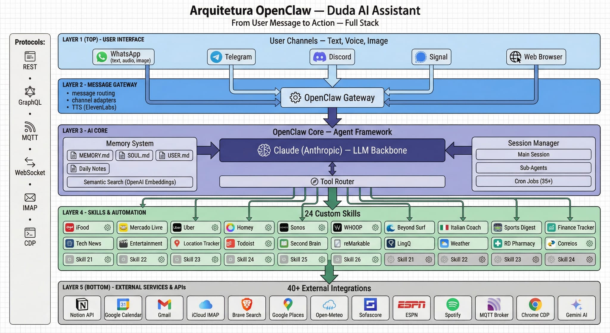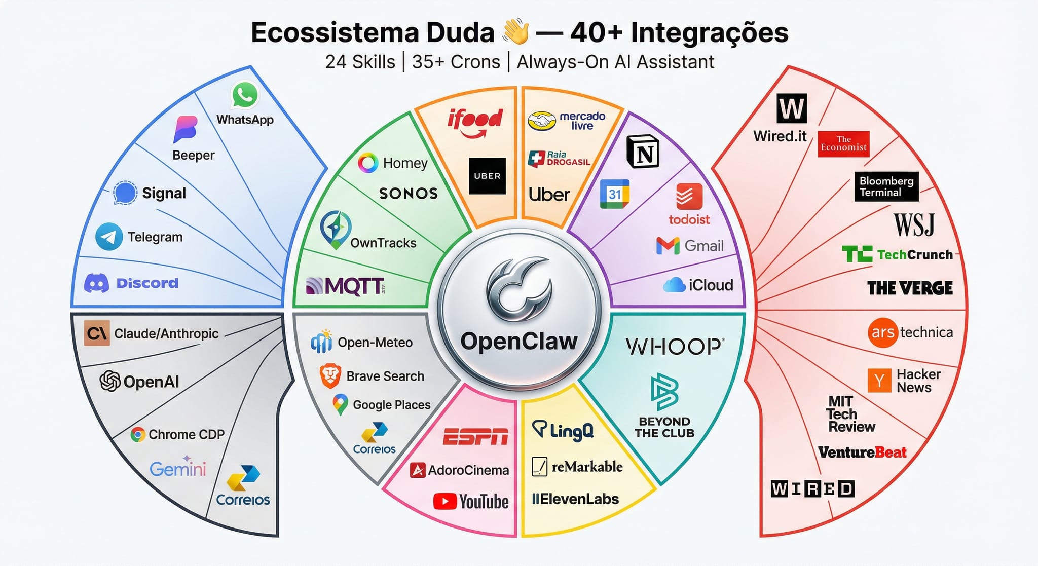 Então, usei o OpenClaw como base para construir algo maior: um ecossistema agentic completo, conectado ao meu mundo real. Não foi prompt engineering. Foi engenharia de sistemas.